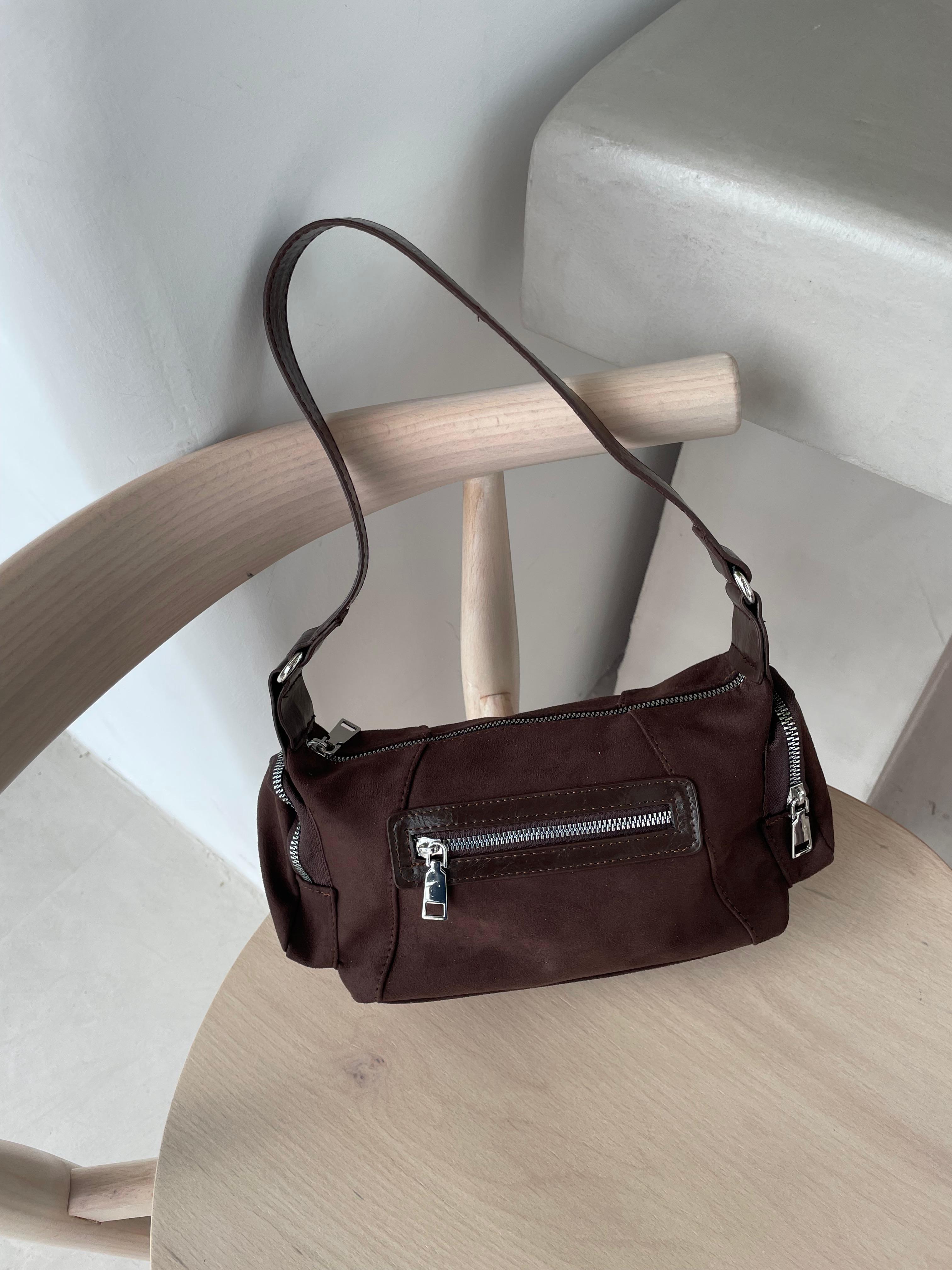Marla : yumuşak süet doku, çok gözlü tasarım, gümüş detaylı omuz çantası.